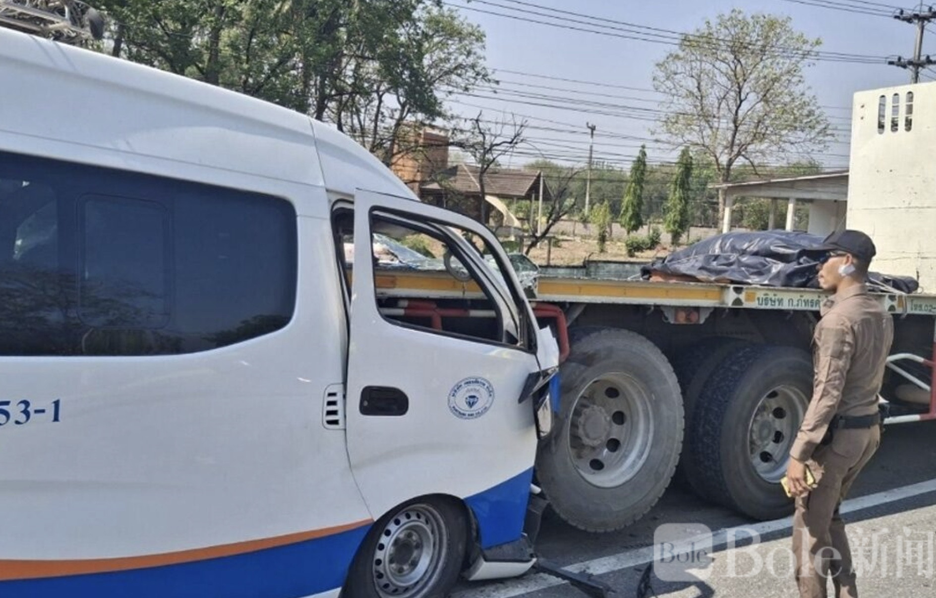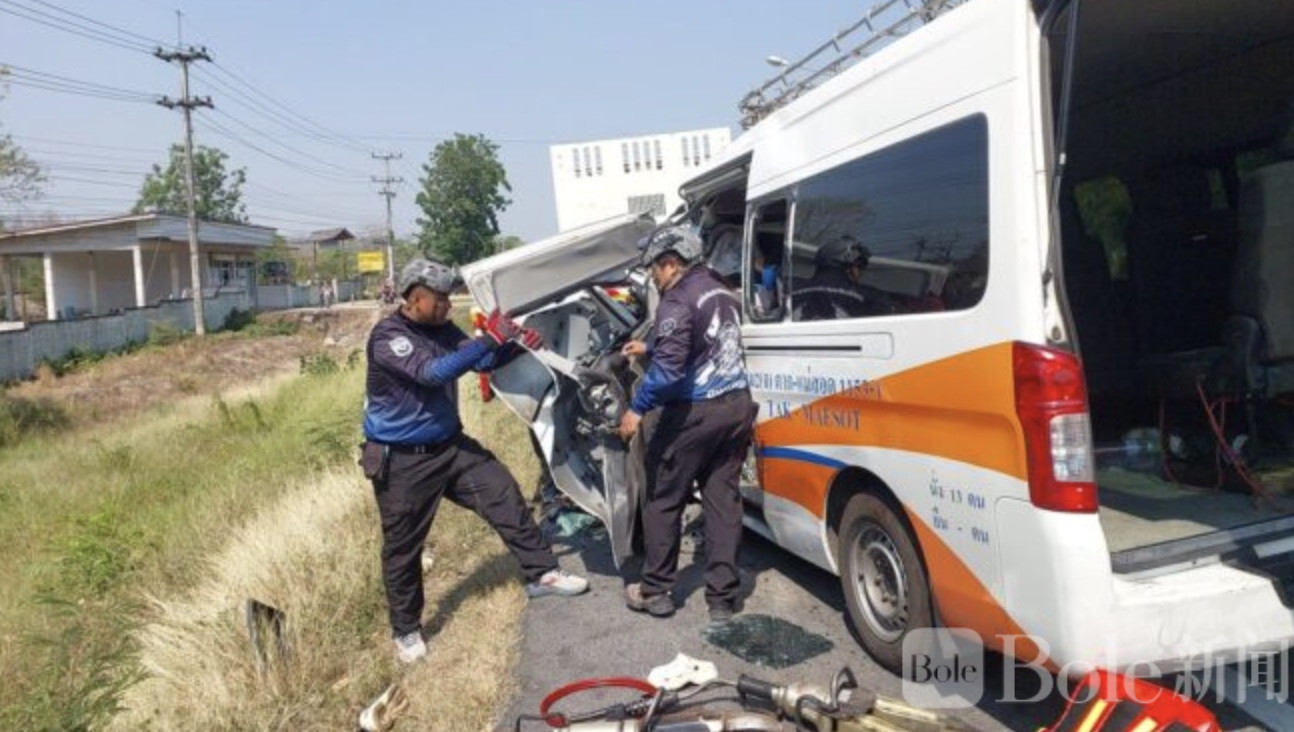 Bole新闻专讯:4月6日下午约14:40,泰国塔克府塔克至美索线路的一辆客运面包车在行驶途中,不幸追尾一辆停在路边的18轮挂车,造成包括司机在内的5人当场死亡,多人受伤,现场情况十分惨烈。