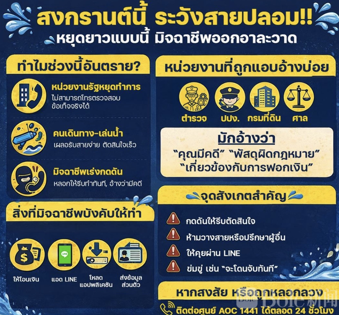 Bole新闻专讯:泰国警方发出紧急提醒,指出宋干节期间电信诈骗案件明显增多,不法分子频繁冒充政府官员实施诈骗,呼吁民众提高警惕,避免落入陷阱。