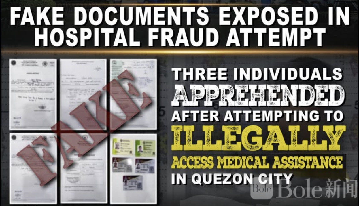 Bole新闻专讯:菲律宾奎松市基里诺纪念医疗中心近日揭发一起医疗援助诈骗未遂案件,3名嫌疑人因提交伪造文件试图非法领取政府补助,当场被警方控制。