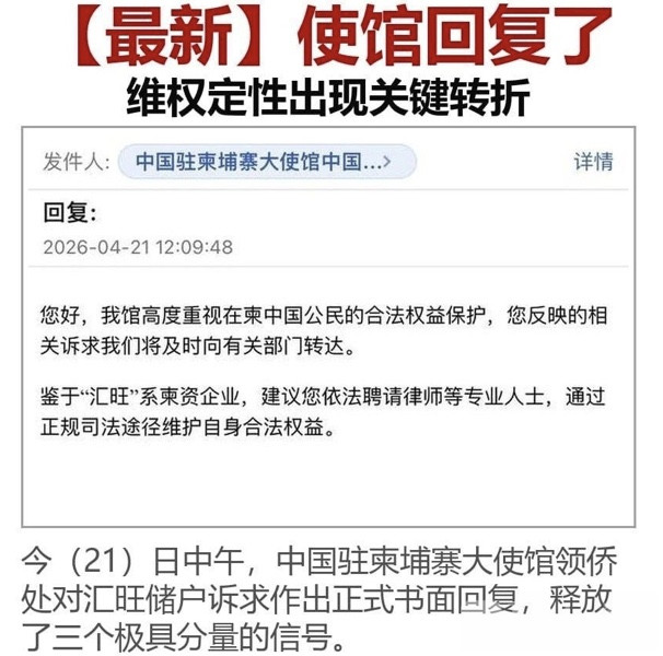 与此同时,使馆在回复中还特别指出,汇旺属于柬埔寨本地企业,并建议相关当事人通过司法途径维护自身权益。乍看之下,这是常规的法律提醒,但在当前时间节点上,也被不少观察人士解读为“指明方向”。尤其是在外界普遍关注4月24日柬埔寨央行可能涉及的清算或沟通安排之际,这样的表态似乎在某种程度上划出了维权路径——外交层面关注与沟通持续推进,而具体资金清算与责任认定,则需要通过当地法律程序来完成。