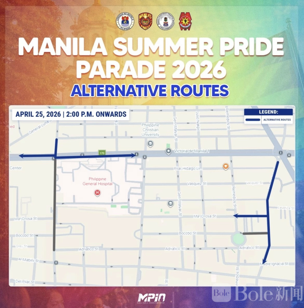 Bole新闻专讯:马尼拉市政府提醒市民,4月25日举行“马尼拉夏日骄傲游行2026”期间,市区多条道路将实施临时封闭与改道措施,部分路段还将采取间歇性交通管制,预计当天交通会出现一定程度拥堵,建议民众提前规划路线,尽量绕行。