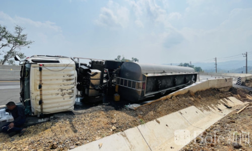 初步调查显示,发生事故的是一家石油公司的运输车辆,当时正载着燃油准备运往老挝。不料车辆在经过弯道时突然失控,拖挂车尾部出现摆动,紧接着整辆车侧翻在路边。事故导致部分燃油从油罐中泄出,估计泄漏量约5000升,占车上总油量4万升的一小部分。