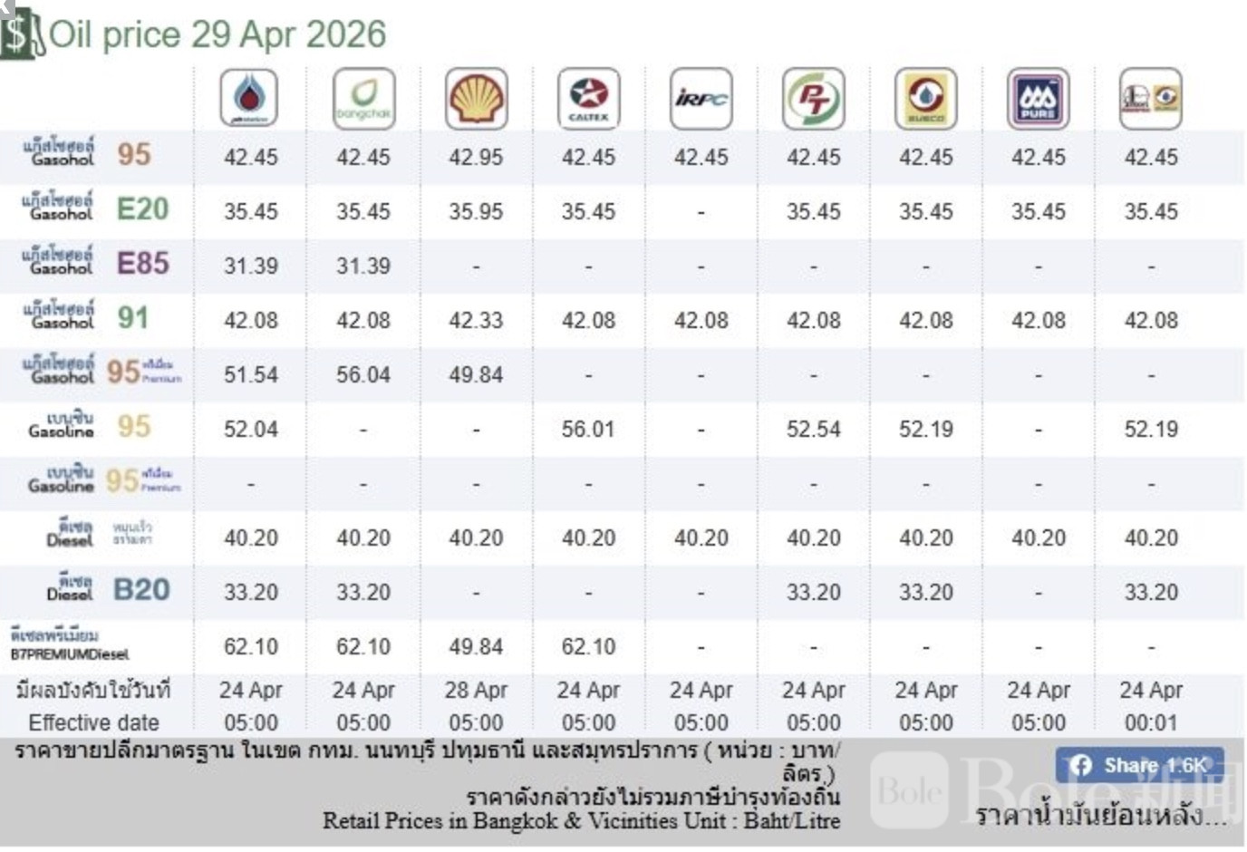 Bole新闻专讯:泰国能源部下属政策与规划办公室公布2026年4月29日最新油价数据,涵盖5大主流加油站,包括PTT、Bangchak、PTG Energy、Caltex及Shell。整体来看,各品牌油价差异不小,部分高端油品价格差距明显。
