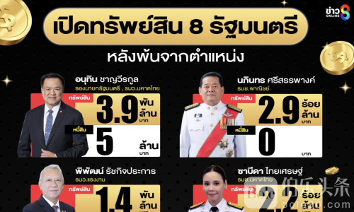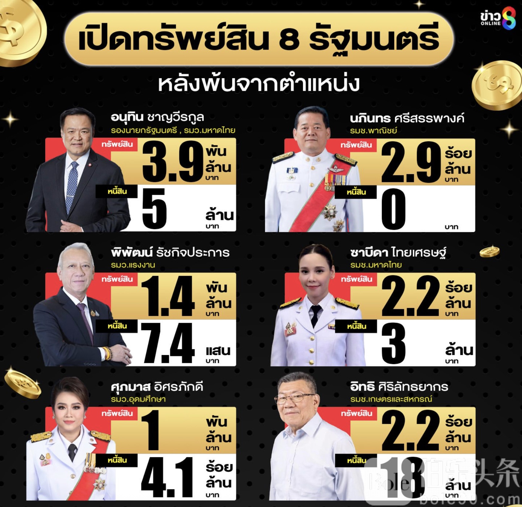 伯乐头条专讯:泰国国家反腐败委员会(NACC)近日公布了8名前内阁成员卸任后的资产与负债情况,引发社会热议。其中,前副总理兼内政部长、现任总理阿努廷以近40亿泰铢的身家稳居榜首,远超其他人,成为外界关注的焦点。