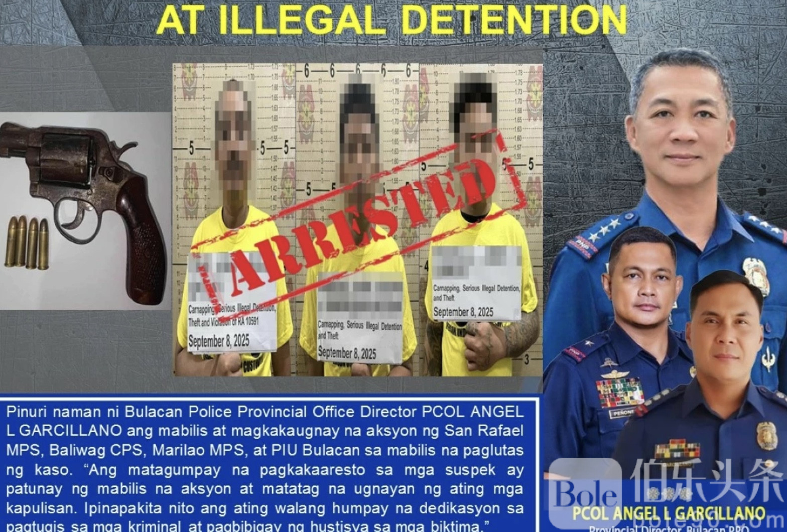 伯乐头条专讯:菲律宾布拉干省近日发生一起触目惊心的劫车绑架案。一名42岁来自大马尼拉塔吉格市的运输服务司机,在接单途中竟被4名乘客蒙眼、关押在旅馆房间内,险些丧命。所幸他机智跳窗逃生,并在酒店员工协助下报警,最终警方迅速出击,3名嫌犯落网,另有一名女子自首。