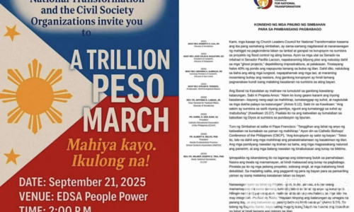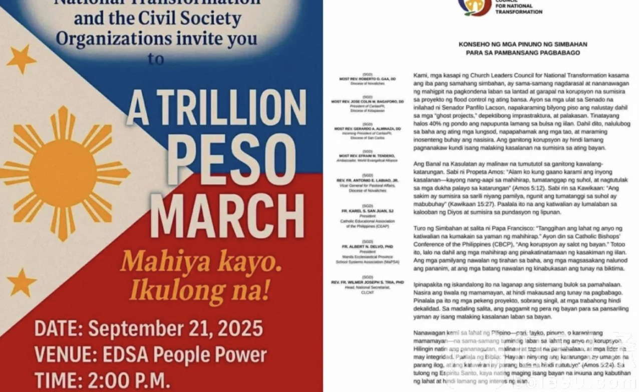 伯乐头条专讯:菲律宾正酝酿一场足以撼动政权的巨浪!全国转型教会领袖委员会宣布,将在 9月21日下午2点 于马尼拉EDSA大道发起 “万亿披索大游行”,矛头直指防洪工程中被揭出的惊天腐败。