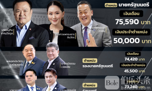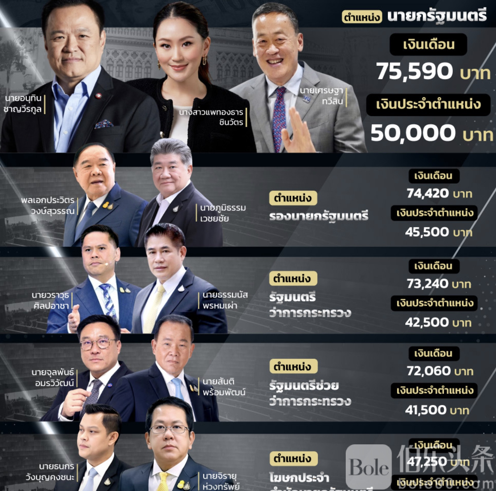 • 总理:月薪 75,590 泰铢 + 津贴 50,000 泰铢