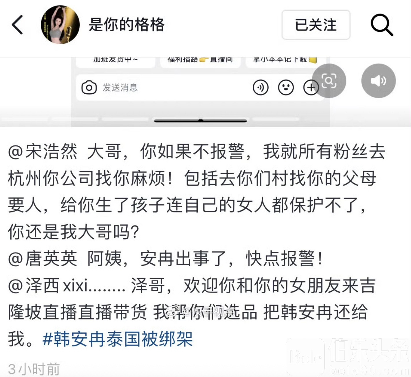 事情起因于音乐人账号“是你的格格”在社交平台发文,声称韩安冉在泰国遇险,并@雷军、赵露思等大V求助报警。消息一出立刻引爆关注,不少网友担心韩安冉安危。