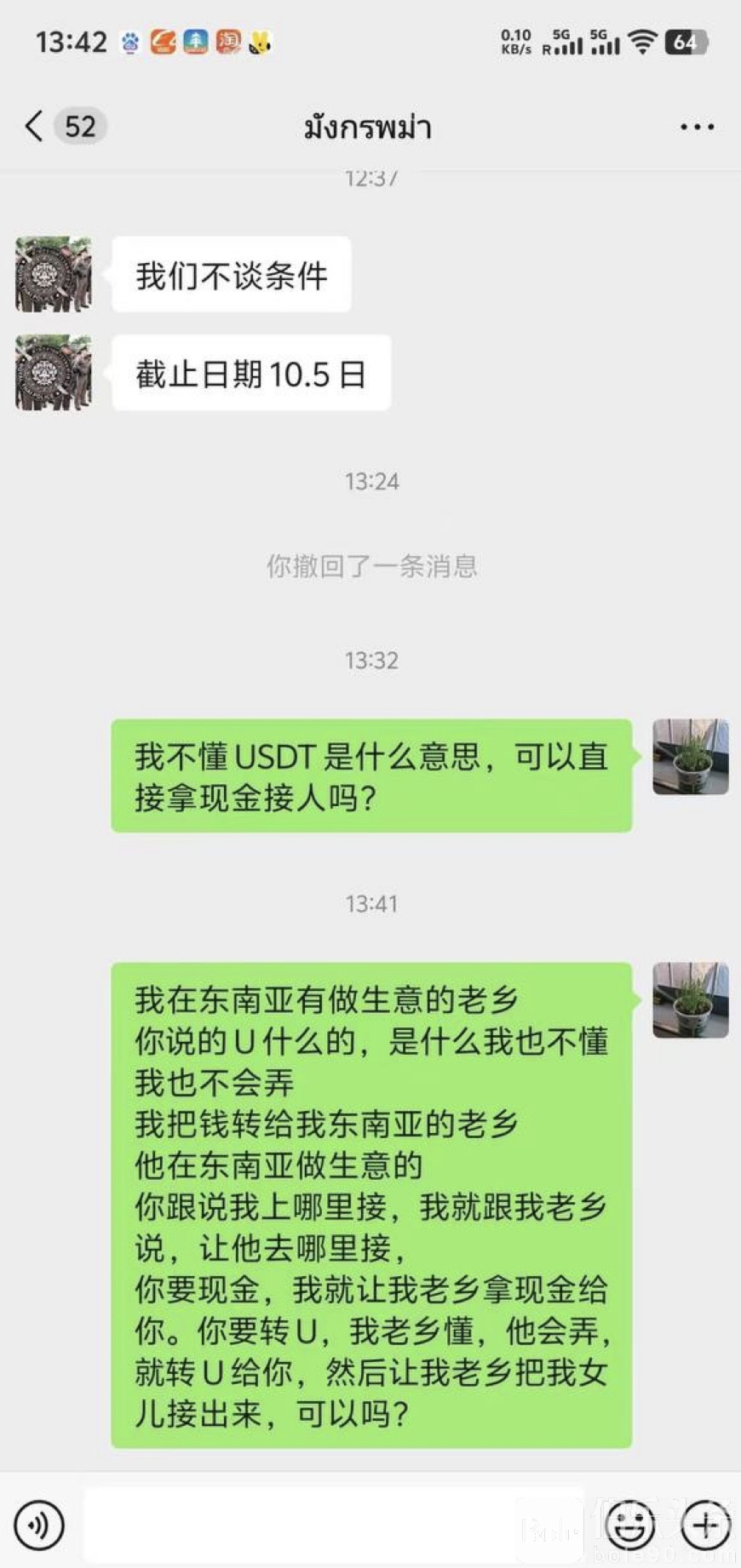 在交涉过程中,家属提出能否现金交付或通过第三方营救,但绑匪态度强硬,坚称“只收USDT,不谈条件”,并反复强调所谓“江湖规矩”。