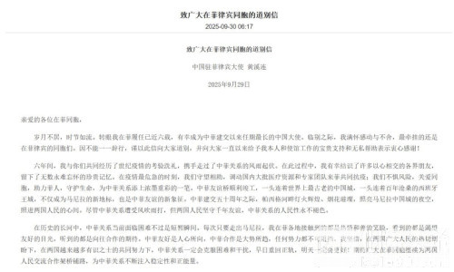岁月不居,时节如流。转眼我在菲履任已近六载,有幸成为中菲建交以来任期最长的中国大使。临别之际,我满怀感动与不舍,最牵挂的还是在菲律宾的同胞们。因不能一一辞行,谨以此信向大家道别,并向大家一直以来给予我本人和使馆工作的宝贵支持和无私帮助表示衷心感谢!