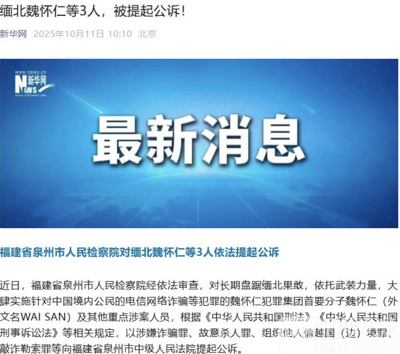 伯乐头条专讯:缅北“电诈帝国”又有重磅进展!福建省泉州市人民检察院近日正式对长期盘踞缅甸果敢地区、专门针对中国公民实施电信诈骗的魏怀仁犯罪集团提起公诉。