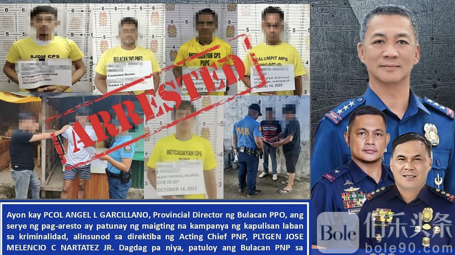 伯乐头条专讯:菲律宾布拉干省警方近日展开全省范围缉捕行动,成功逮捕6名涉嫌多项罪行的通缉犯,案件涵盖杀人未遂、猥亵、轻伤、违反地方条例及“空头支票法”等多种罪名,行动震撼当地。