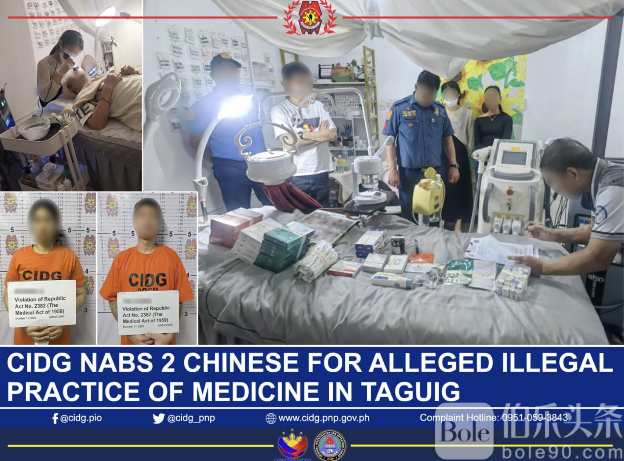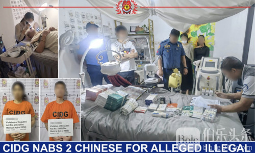伯乐头条专讯:菲律宾国家警察刑事侦查组(CIDG)于10月11日晚突袭塔吉格市一处高档美容院,当场逮捕两名涉嫌非法行医的中国籍男女,并查获大量注射药剂与医美设备!