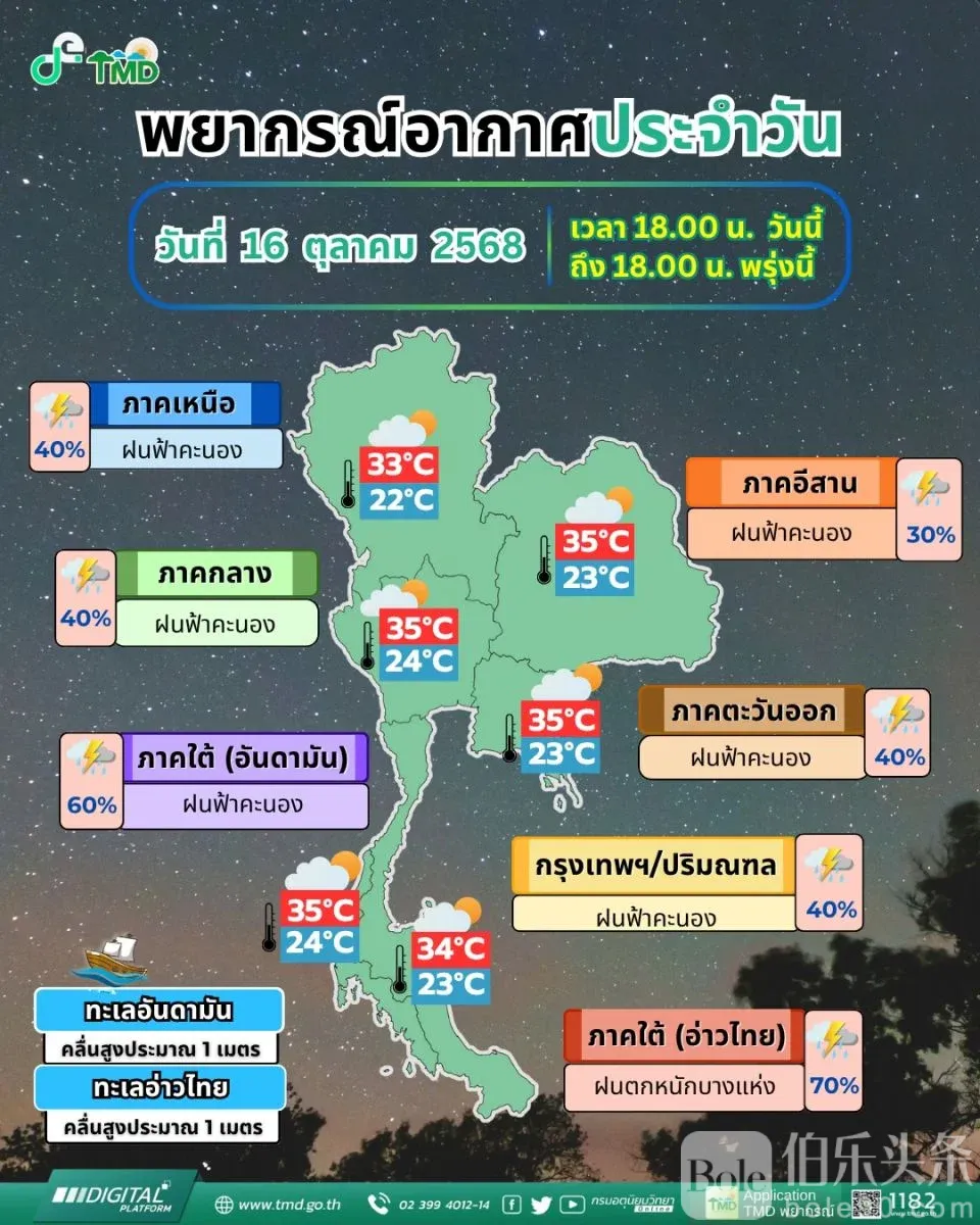 伯乐头条专讯:泰国气象局发布全国性暴雨警报,由于强烈东风和东南风持续影响,全国多地将迎来零星雷阵雨、局部强降雨及海面风浪加剧,尤其是南部沿海地区。官方提醒民众保持警惕,低洼及易涝地区需加强防范,同时船只及沿海社区应做好防风防浪准备。