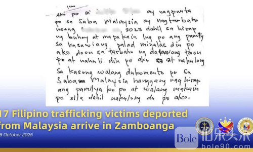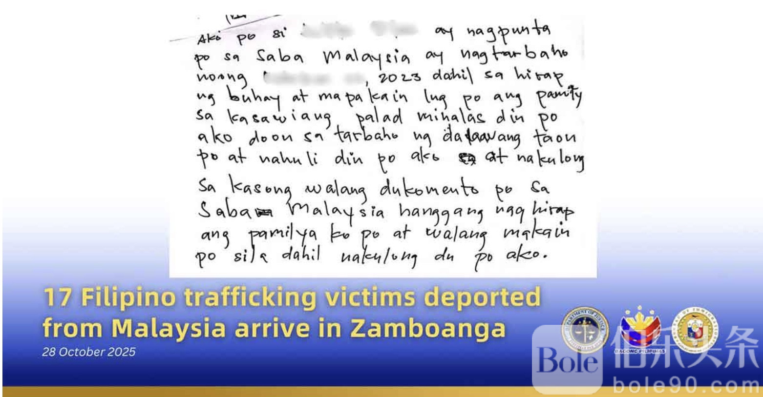 伯乐头条专讯:菲律宾17名遭人口贩卖的受害者于10月25日乘坐MV Antonia从马来西亚被遣返回抵达棉兰老岛棉兰老市。此次遣返人员包括一个四口之家——父母及两名儿子,他们于2023年通过俗称“后门”的非法移民通道,从苏禄群岛乔洛岛乘快艇出境。父亲原被承诺在马来西亚一家中资棕榈油公司担任种植工,每月工资2,000马币,其家人随后跟随,却在遭受雇主虐待两年后寻求帮助。