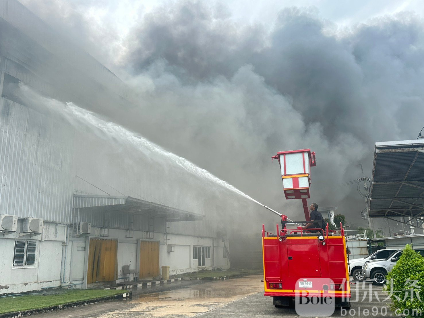 伯乐头条专讯:10月29日,泰国春蓬府一处冷冻动物饲料加工厂发生火灾,火势持续超过2小时,整个仓库几乎被烧毁。起火原因疑似操作燃气设备时失控,所幸无人伤亡,仅有部分员工出现烟雾吸入不适。