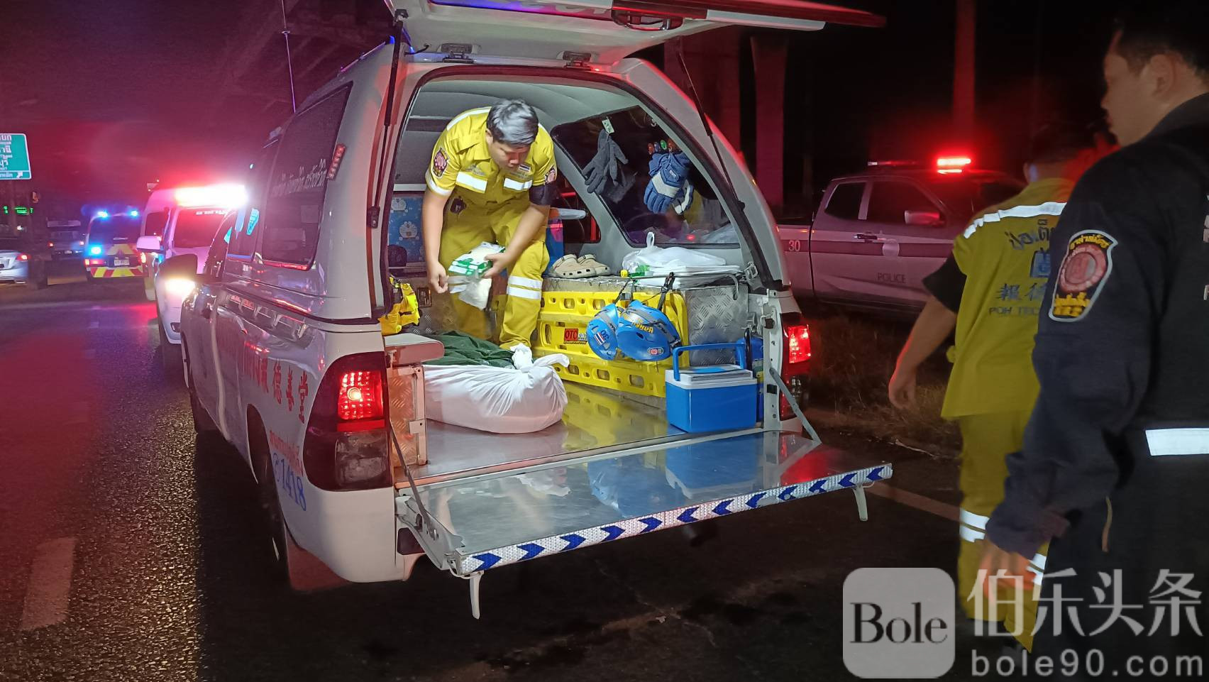 事故发生在凌晨2时45分左右,地点位于巴吞他尼直辖县国立戒毒中心对面路段。警方和救援人员赶到现场时,发现一辆白色伊苏祖箱式货车停在路边,车底卡着死者遗体,头骨碎裂,当场身亡。附近约20米处还倒着一辆被撞毁的白色本田Wave摩托车。