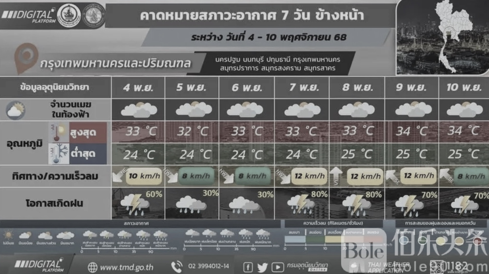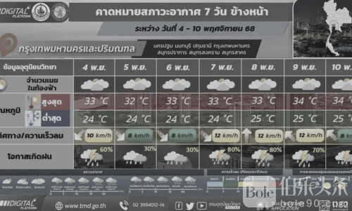 气象局表示,曼谷正处于强降雨带核心区,预计全市60%的区域将出现雷阵雨或局部暴雨,最高气温31–33°C,最低24–25°C。过去24小时内,Bang Khun Thian区Khlong Ra Han公交站降雨量高达74毫米,Chatuchak区与Lak Si区也突破60毫米,短时强降雨造成城市排水系统不堪重负。