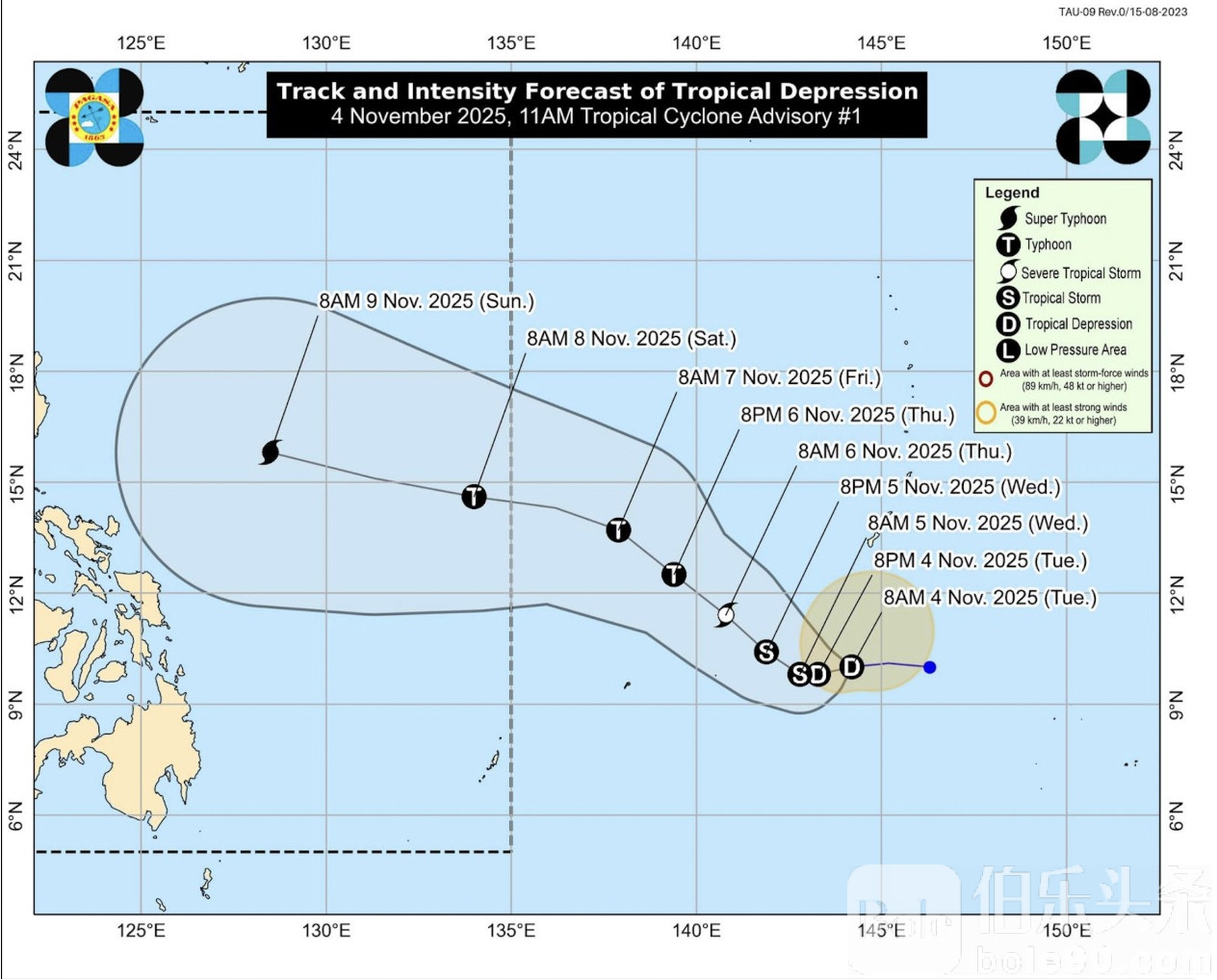 伯乐头条专讯:菲律宾大气地球物理暨天文服务局(Pagasa)周二发布警告称,一股可能成为超级台风的热带气旋预计将在本周晚些时候进入菲律宾责任海域(PAR),并可能对全国造成重大影响。