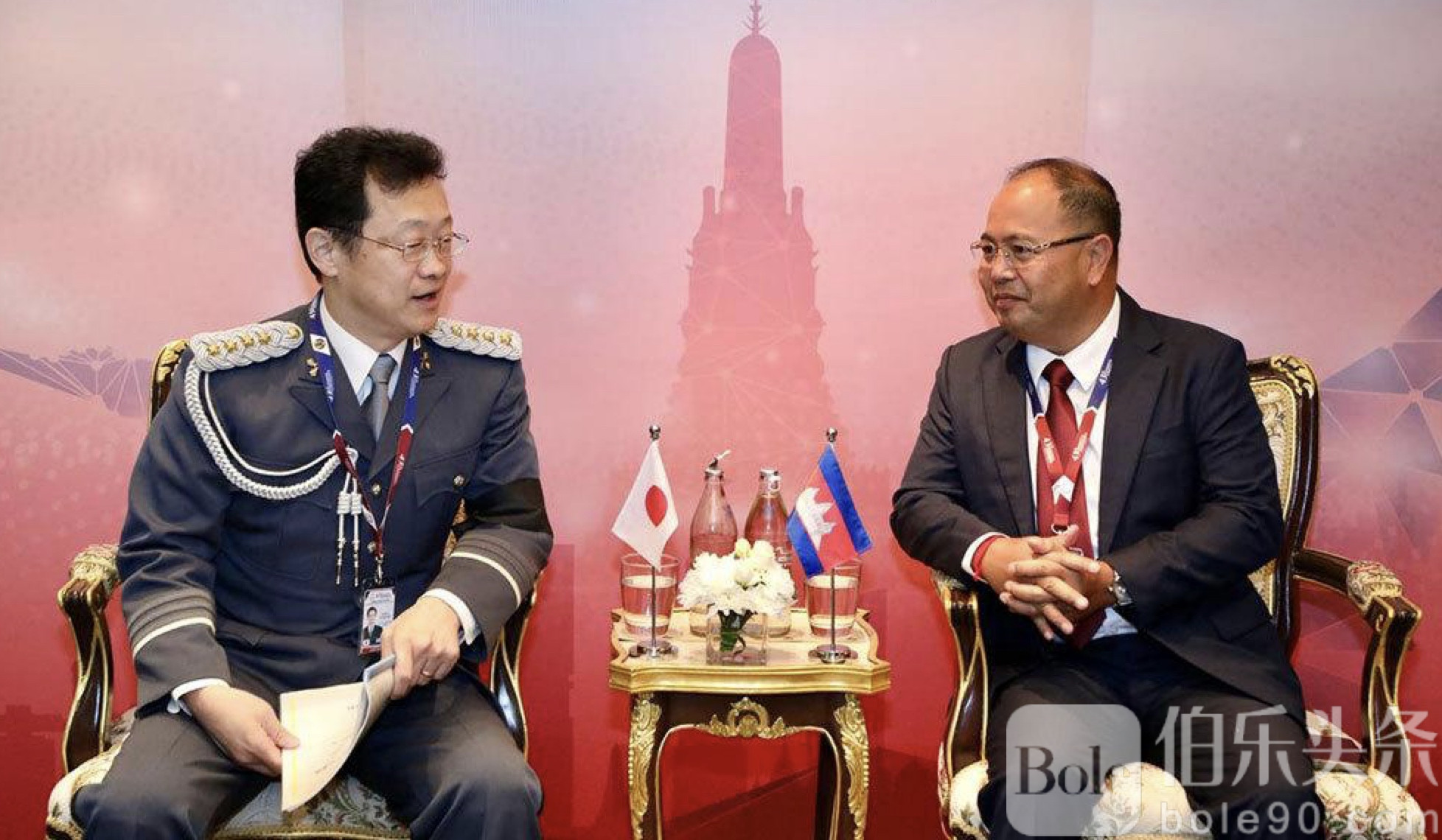 伯乐头条专讯:在泰国曼谷举行的第43届东盟警察首长会议期间,柬埔寨国家警察总署副总监森万那维拉(Sok Vannavira)于11月5日上午分别会见了日本警察厅副厅长高一·立川(Koichi Tachikawa)以及韩国警察厅国际合作局局长兼国际刑警韩国国家中心局局长李载英(Lee Jae Young)。