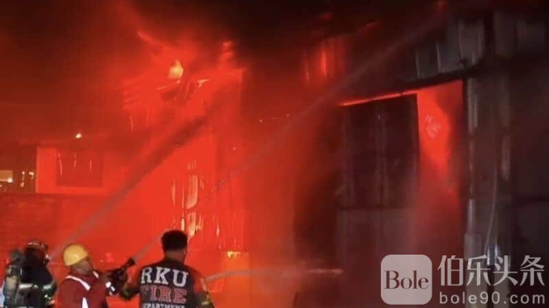 伯乐头条专讯:11月6日凌晨,泰国曼谷拉差布拉那区一处仓库突发大火,现场火光冲天并伴有多次爆炸声,黑烟滚滚,方圆数公里可见,消防员紧急出动扑救。