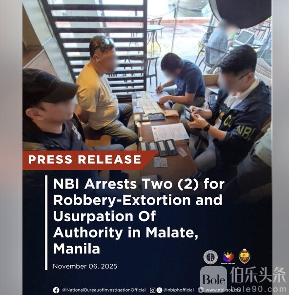 伯乐头条专讯:菲律宾国家调查局(NBI)近日在马尼拉马拉特区展开行动,成功逮捕两名假冒NBI特工、涉嫌勒索企业的男子。两人伪装成调查局情报部门人员,以“查封威胁”为由向企业索取保护费,最终被正牌特工当场抓获。