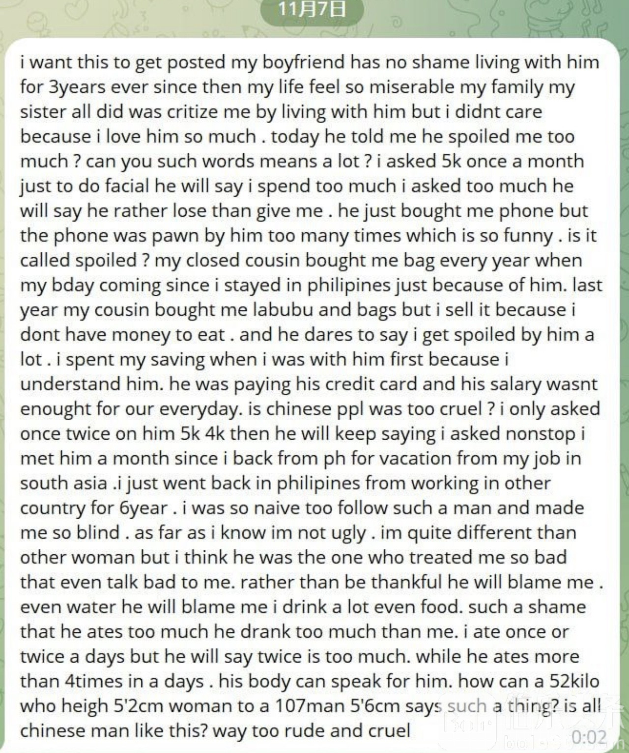 女子表示,她并不丑,与其他女性不同,但却被男友言语羞辱,常常责怪和贬低她。她质问:“难道所有中国男人都如此无礼又残忍吗?”她在投稿中直言不讳,男友甚至连5000比索的正常开销都不愿支付,令她心灰意冷。
