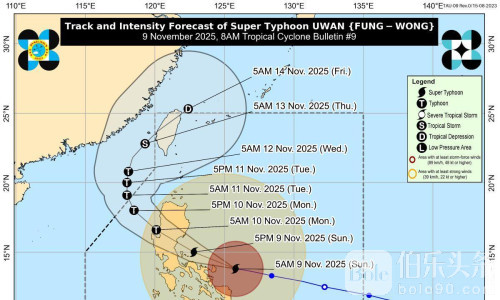伯乐头条专讯:菲律宾气象局(PAGASA)今晨紧急发布警报——超强台风“乌万”(Uwann)全面升级,风力直逼历史极值!截至11月9日上午7时,台风中心位于卡坦端内斯省维拉克东北偏东约125公里处,中心最大风速高达每小时185公里,阵风达230公里,正以每小时25公里速度向西北偏西方向逼近吕宋岛。