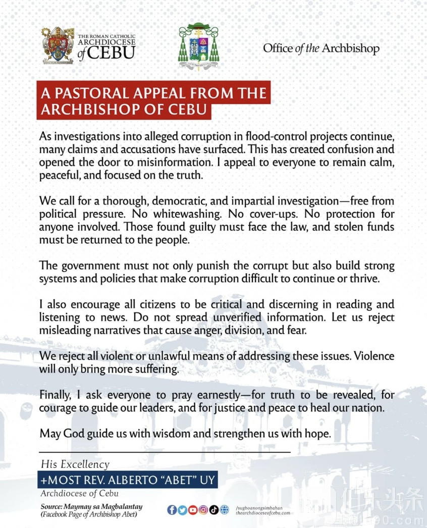 伯乐头条专讯:菲律宾宿务总教区在政府腐败指控不断升温之际发表牧函呼吁,要求当局彻查腐败案件,确保调查公正、民主、独立,远离政治压力。宿务大主教阿尔贝托·乌伊(Alberto Uy)表示:“必须进行全面、民主、公正的调查,不能遮掩、不能庇护任何涉案人员,违法者必须依法惩处,被盗资金应归还人民。”