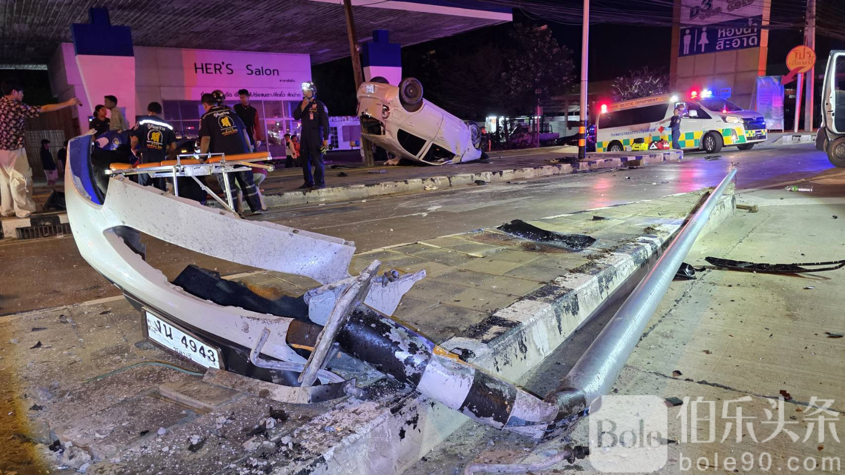 伯乐头条专讯:2025年11月17日中午,泰国春武里府沙美区发生严重交通事故,一辆白色日产March轿车在沙美路螺旋鱼叉路口失控冲出弯道,撞上路中央照明杆后翻车,造成车内五人受伤,其中两人死亡,三人重伤。事故现场照明杆倒塌,消防及救援人员迅速赶赴现场施救,并将伤者送往当地医院。