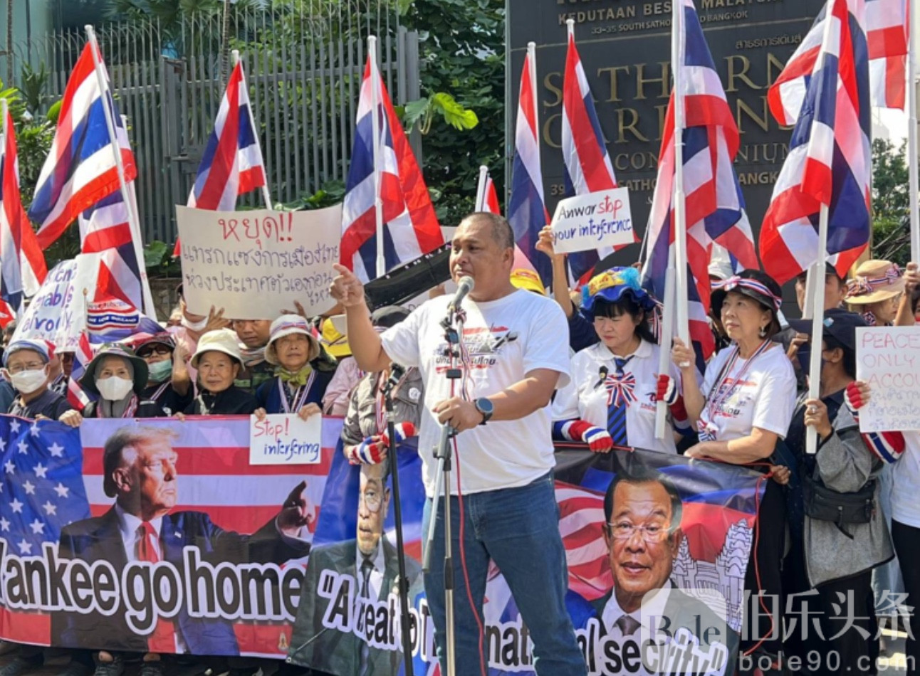 示威者手举巨幅海报,上面印着特朗普、安瓦尔及洪森三人的肖像,并写着“A threat to Thai national security”(对泰国国家安全的威胁)。现场群众不断挥舞泰国国旗,并举牌写着“停止干涉泰国”“东盟主席必须保持中立”等口号,情绪激动。