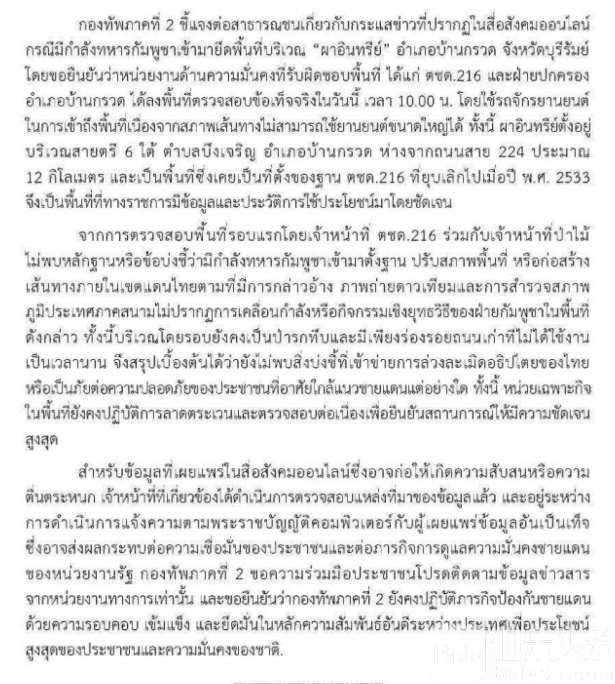 第二军区呼吁民众:请仅参考政府及军方正式发布的消息,避免误信未验证来源的社交媒体内容。军方也重申,将持续以克制与专业方式维护与邻国的友好关系,并确保泰国边境地区的和平与安全。