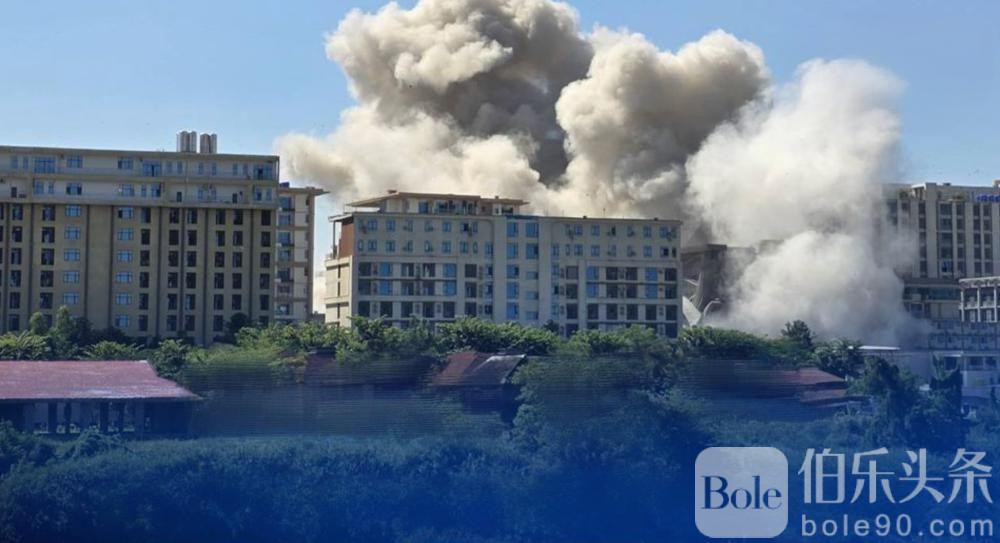 爆破行动于今日下午准时进行,地点位于紧贴缅泰交界的湄河边,一栋12层高楼被安置炸药。爆炸瞬间巨响回荡在整个瑞沟谷,泰国美索一侧的居民也能清楚听见。随后大量烟尘冲天而起,肉眼可见建筑在数秒内整体崩塌,成为废墟。