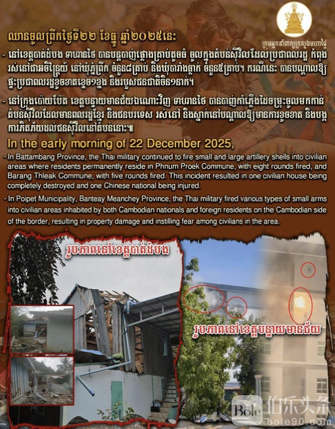 伯乐头条专讯:12月22日清晨,柬埔寨国防部通报称,泰国军队在柬泰边境平民聚居区发起炮击,造成民宅损毁及人员伤亡,其中包括一名中国公民受伤。