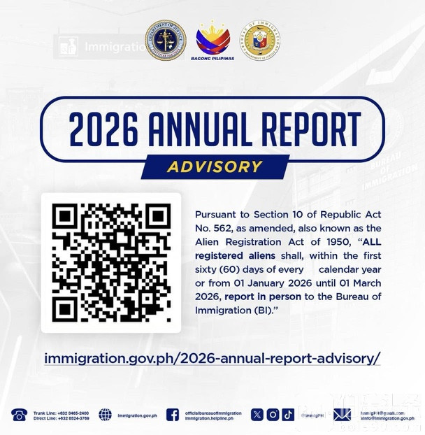 伯乐头条专讯:菲律宾移民局12月24日发布公告,提醒所有在菲律宾登记在册的外籍人士,2026年度的年度报到手续正式启动。根据规定,每位外籍人士必须在每年日历年的前60天内,亲自前往移民局完成报到,否则可能面临罚款、行政处罚,甚至影响签证或居留身份。