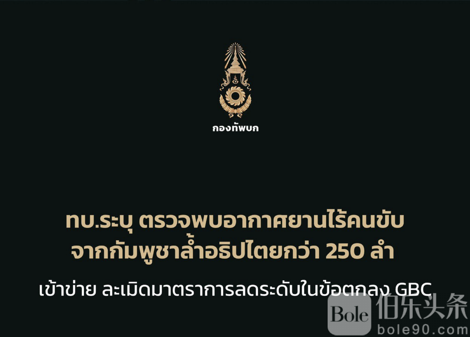伯乐头条专讯:12月29日下午泰国皇家陆军发言人泰温宣布,昨日(12月28日)晚间,共有超过250架无人机从柬埔寨进入泰国领空,飞入乌汶府、四色菊府及武里南府边境区域。