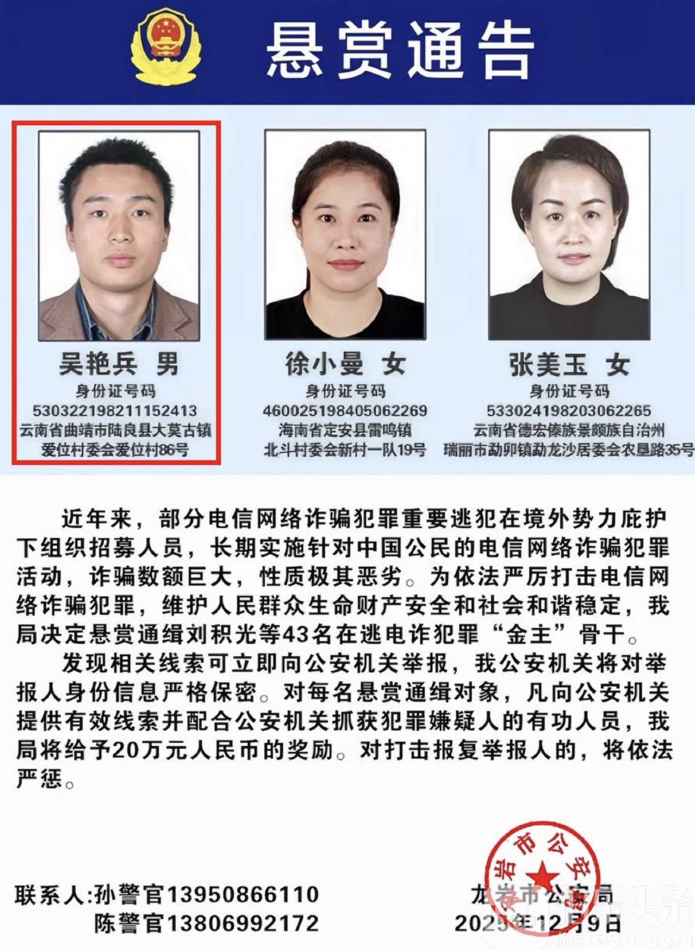 伯乐头条专讯:中国公安部近日发布通告,对100名电信网络诈骗在逃金主及骨干成员公开通缉,一场针对跨境电诈的“清网行动”再度升级。其中,与缅北“四大家族”犯罪集团关系密切的重大逃犯吴艳兵,被列为重点追逃对象,其在柬埔寨的落脚点也随之浮出水面。