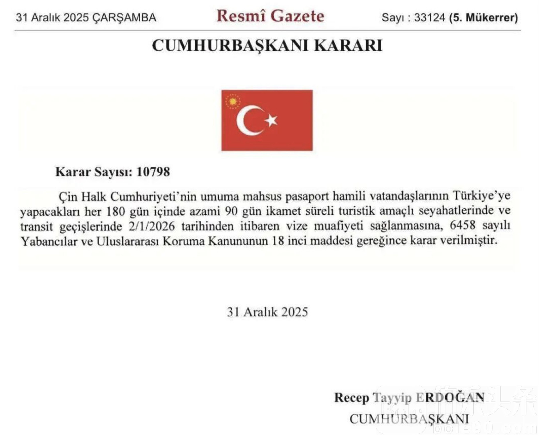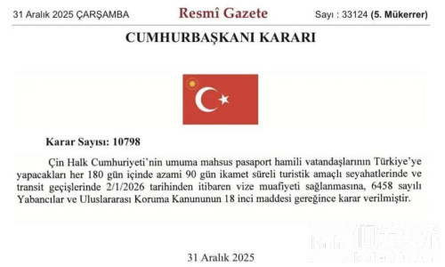 伯乐头条专讯:一则来自土耳其官方的消息,在跨年之际迅速点燃出行圈。当地时间12月31日,土耳其在《官方公报》中发布总统令,明确宣布:自2026年1月2日起,对持中国普通护照的中国公民实行免签入境政策。