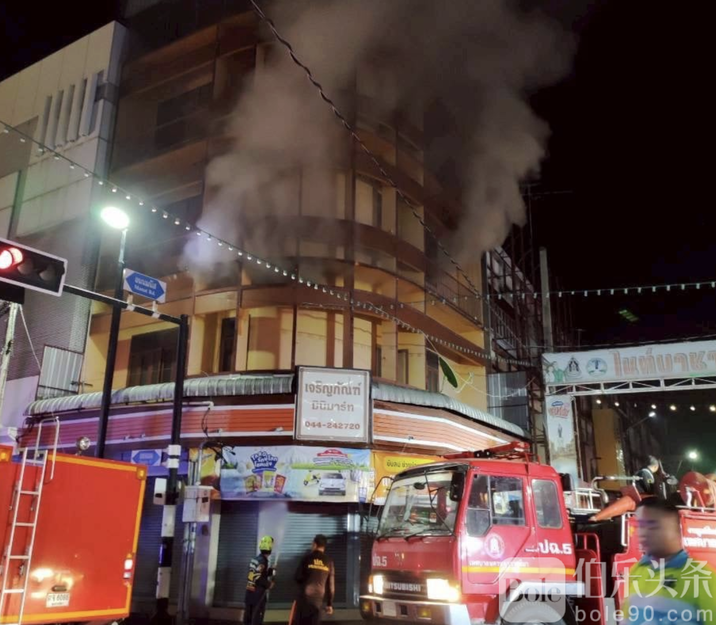 伯乐头条专讯:2026年1月5日深夜,泰国科拉府(Nakhon Ratchasima)市区曼纳斯路(Manat Road)一栋四层商铺“昌潘便利店”(Charoenphan Mini-Mart)突发火灾,火势从一楼迅速蔓延至三楼,现场浓烟滚滚,情况一度危急。消防及救援部门立即调派超过十辆消防车及支援设备前往扑救,最终成功控制火势,防止火势扩散至邻近商铺。
