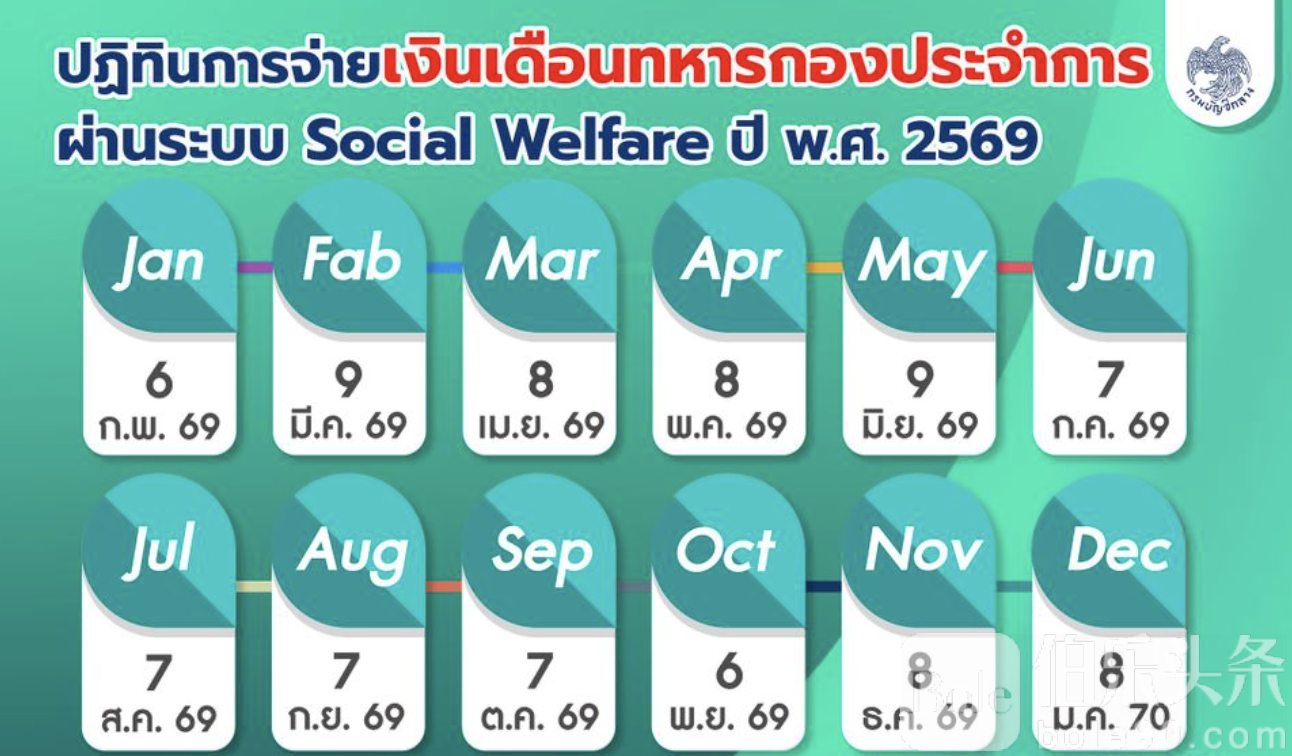 伯乐头条专讯:泰国财政部会计总处近日公布2026年公职人员及军人薪资、养老金发放日历,明确全年的发薪安排,以便相关人员合理安排财务。