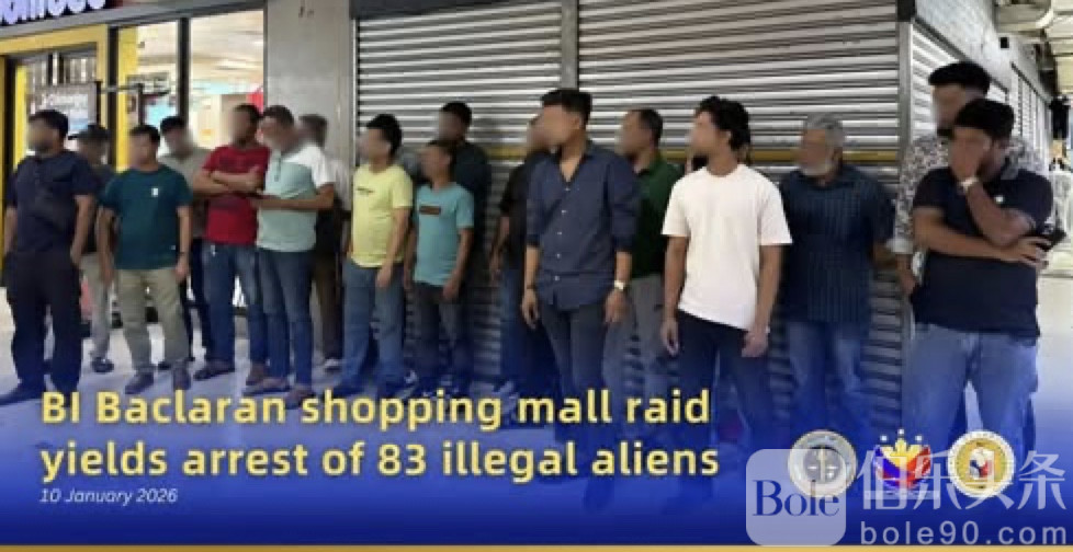 伯乐头条专讯:菲律宾移民局近日再度出手,对非法从事零售经营的外籍人士展开集中执法。1月10日,移民局发布通报称,执法人员于1月7日在帕赛市墨拉兰(Baclaran)一处人流密集的商场内展开突袭行动,当场带走83名外籍人员,其中包括14名中国公民。
