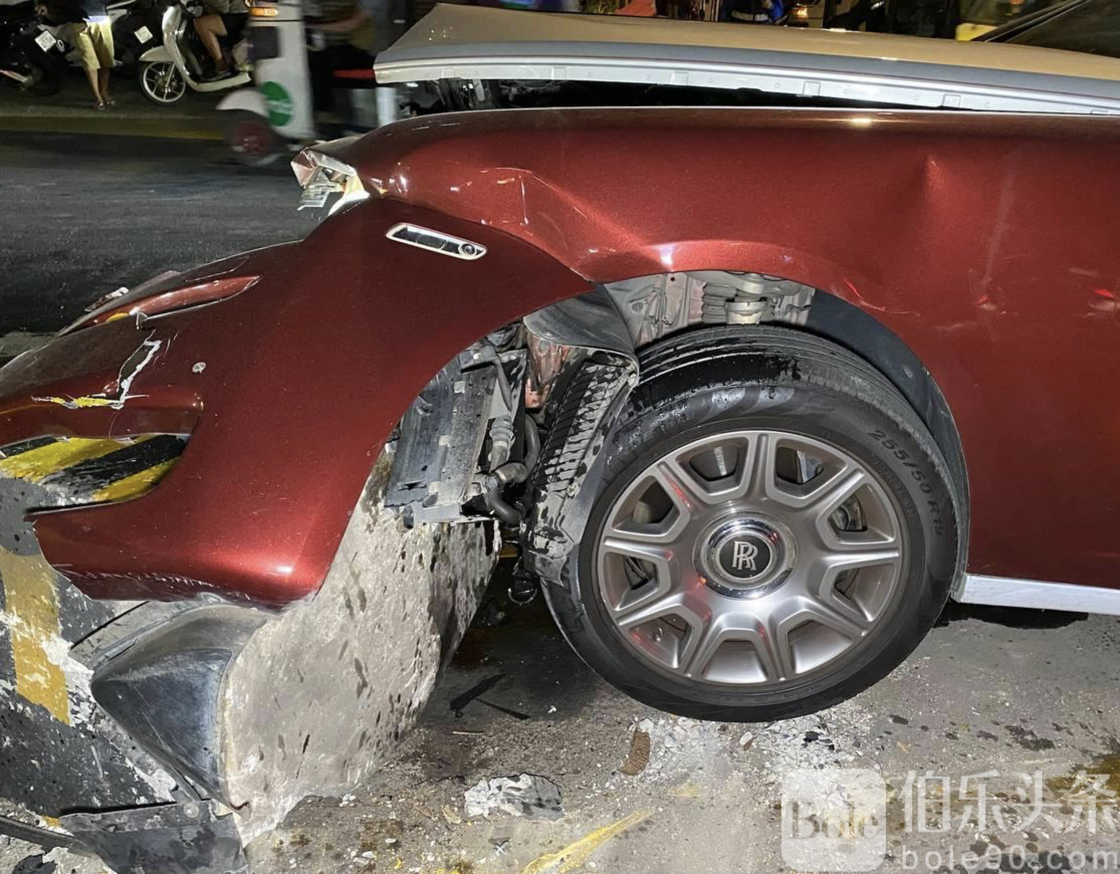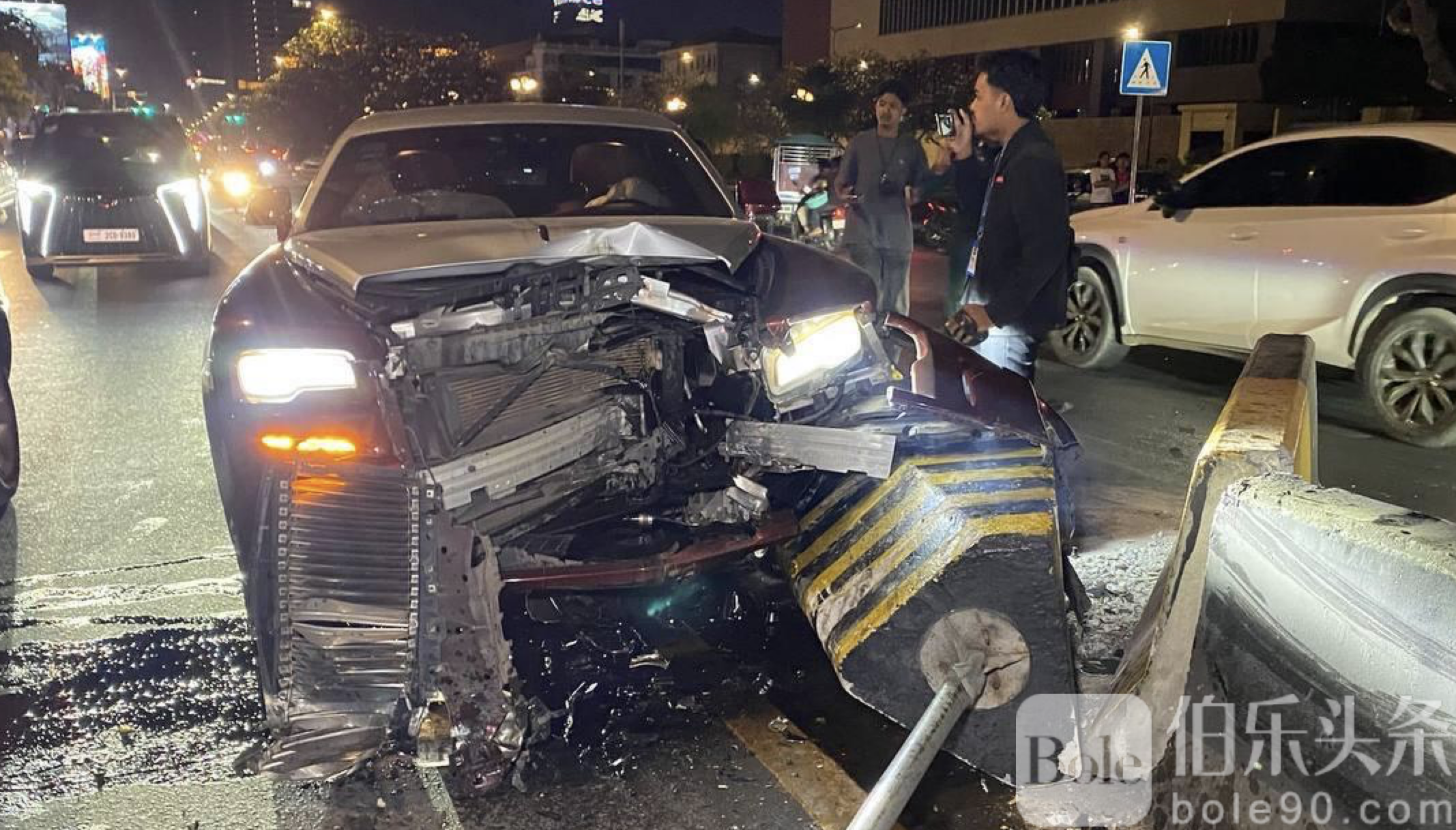 伯乐头条专讯:柬埔寨金边市隆边区1月11日晚间发生一起引发关注的豪车交通事故,一辆由中国籍男子驾驶的劳斯莱斯轿车在深夜高速行驶途中失控,猛烈撞上道路中央石制隔离护栏,车辆及公共设施均遭到严重损毁。