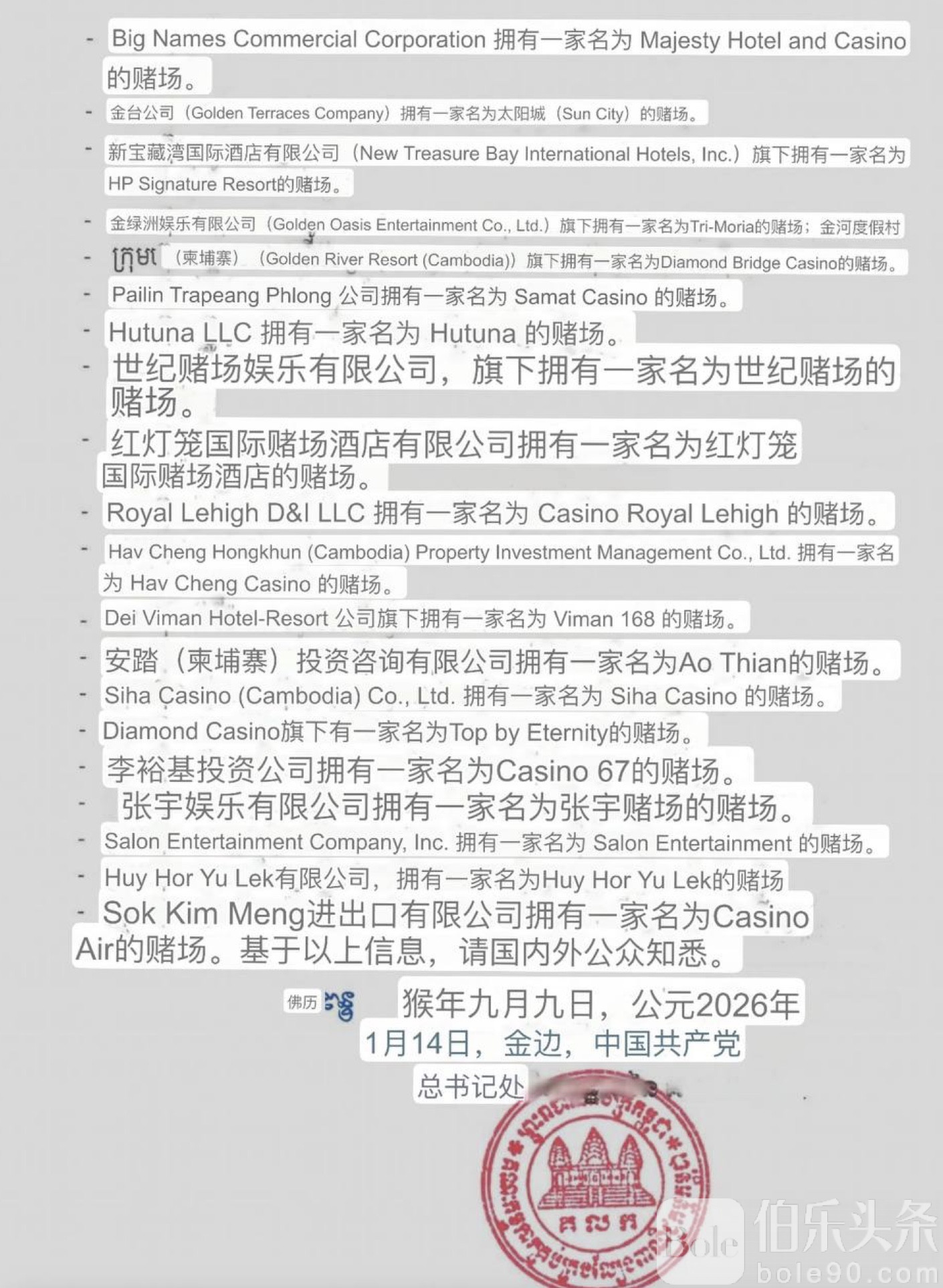伯乐头条专讯:柬埔寨商业博彩委员会(CCGC)总秘书处近日正式对外发布公告,公布目前经国家审查并予以认可的合法赌场名单。官方明确强调:凡未出现在该名单中的园区赌场或博彩场所,均不具备合法经营资格,将成为下一步重点打击和清理对象。