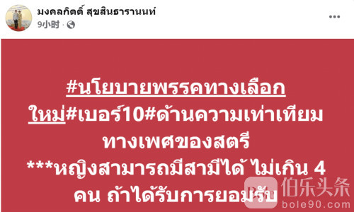 伯乐头条专讯:泰国政坛近日再掀话题风暴。泰国“新选择党”(党号10)总理候选人蒙空吉日前通过个人脸书账号发布最新竞选政策,其中一项有关“女性性别平等”的提议迅速点燃舆论——他主张,在获得社会认可的前提下,女性可以拥有不超过4名丈夫,模式“可参考伊斯兰法律中的相关规定”。