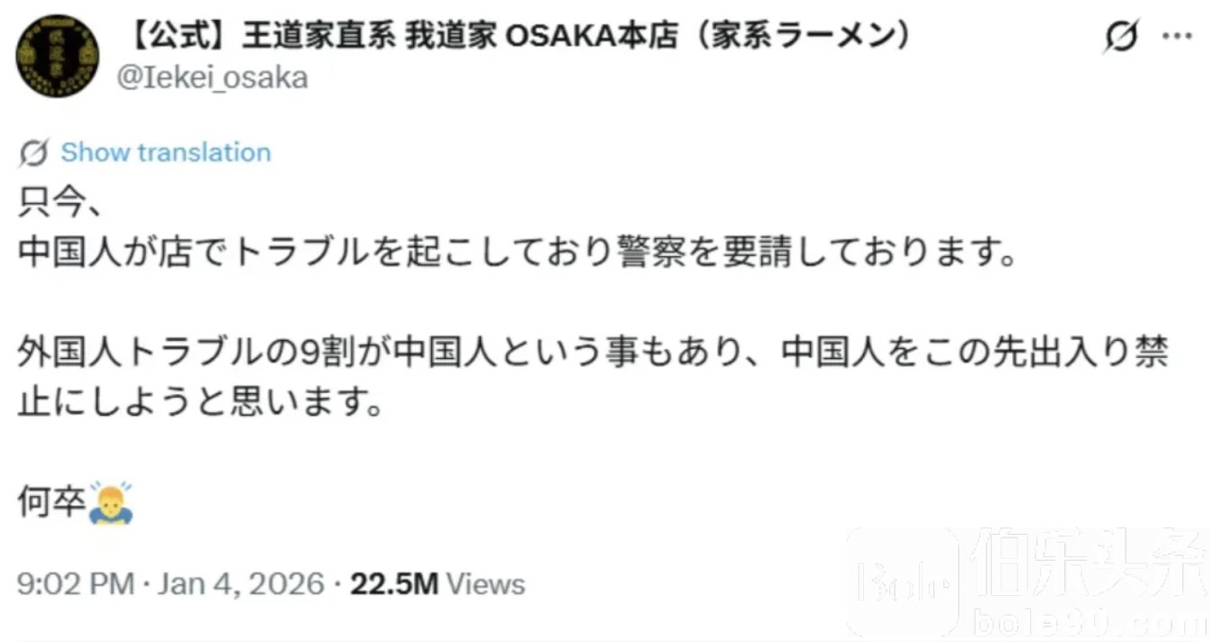 伯乐头条专讯:近日,一家位于日本大阪的日式拉面店,意外被推上国际舆论的风口浪尖。事情本身并不复杂,却在短时间内持续发酵,演变成一场横跨多国的公共讨论。