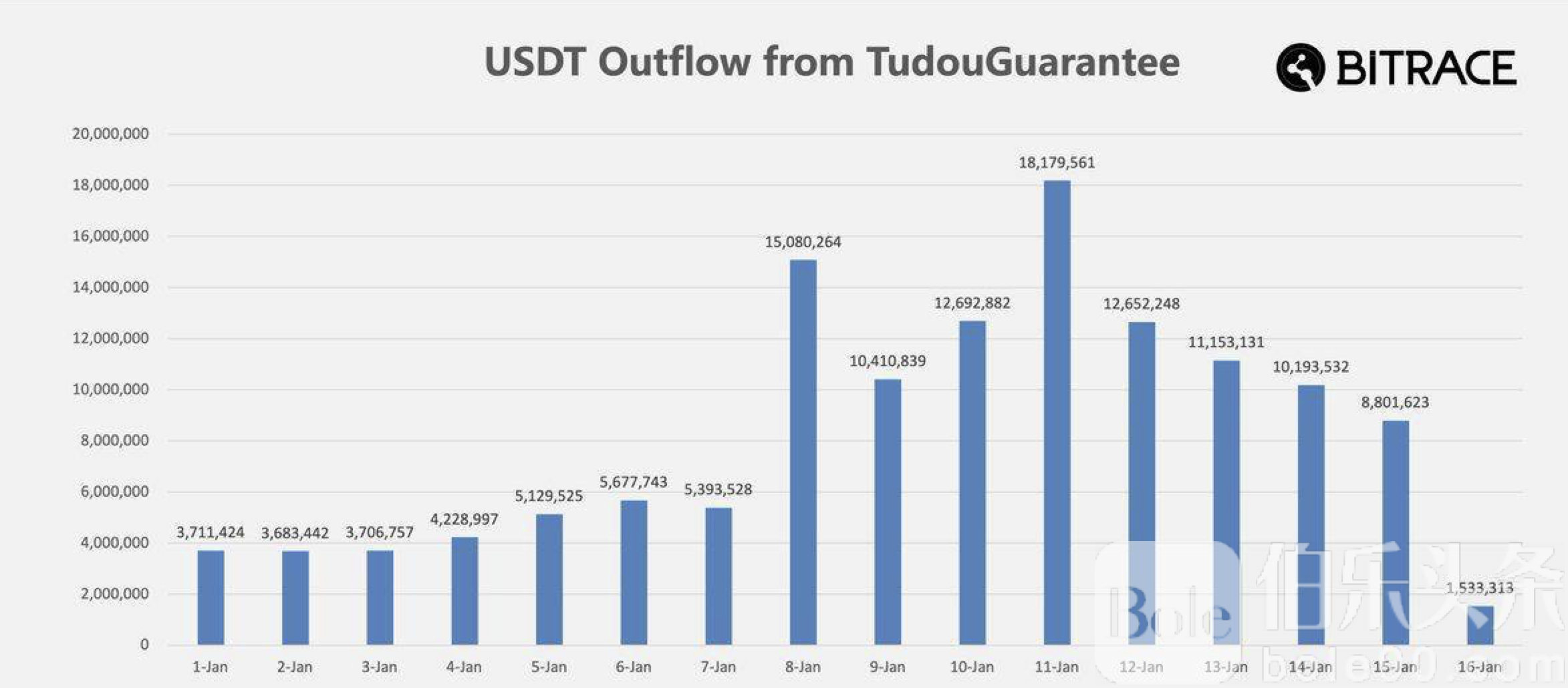 伯乐头条专讯:柬埔寨知名非法交易担保平台土豆担保,自2026年1月8日起,已开始对商户进行大规模退款。据区块链分析公司比特追踪(Bitrace)监测显示,2026年1月1日至1月16日期间,退款总额已超过1.3亿USDT。