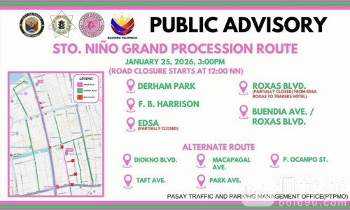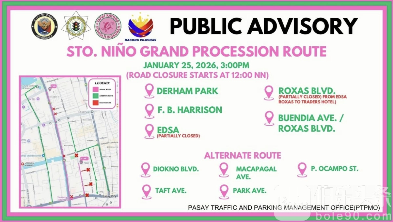 伯乐头条专讯:菲律宾帕赛市政府宣布,为配合1月25日举行的圣婴大游行,将在多条主要道路实施临时封闭或交通管制。市长埃米·卡利克斯托-鲁比亚诺表示,由交通与停车管理办公室(PTPMO)负责监督的道路管制措施,将从当天中午12点开始,以确保参加活动的信众安全,并保证下午3点开幕的宗教活动顺利进行。