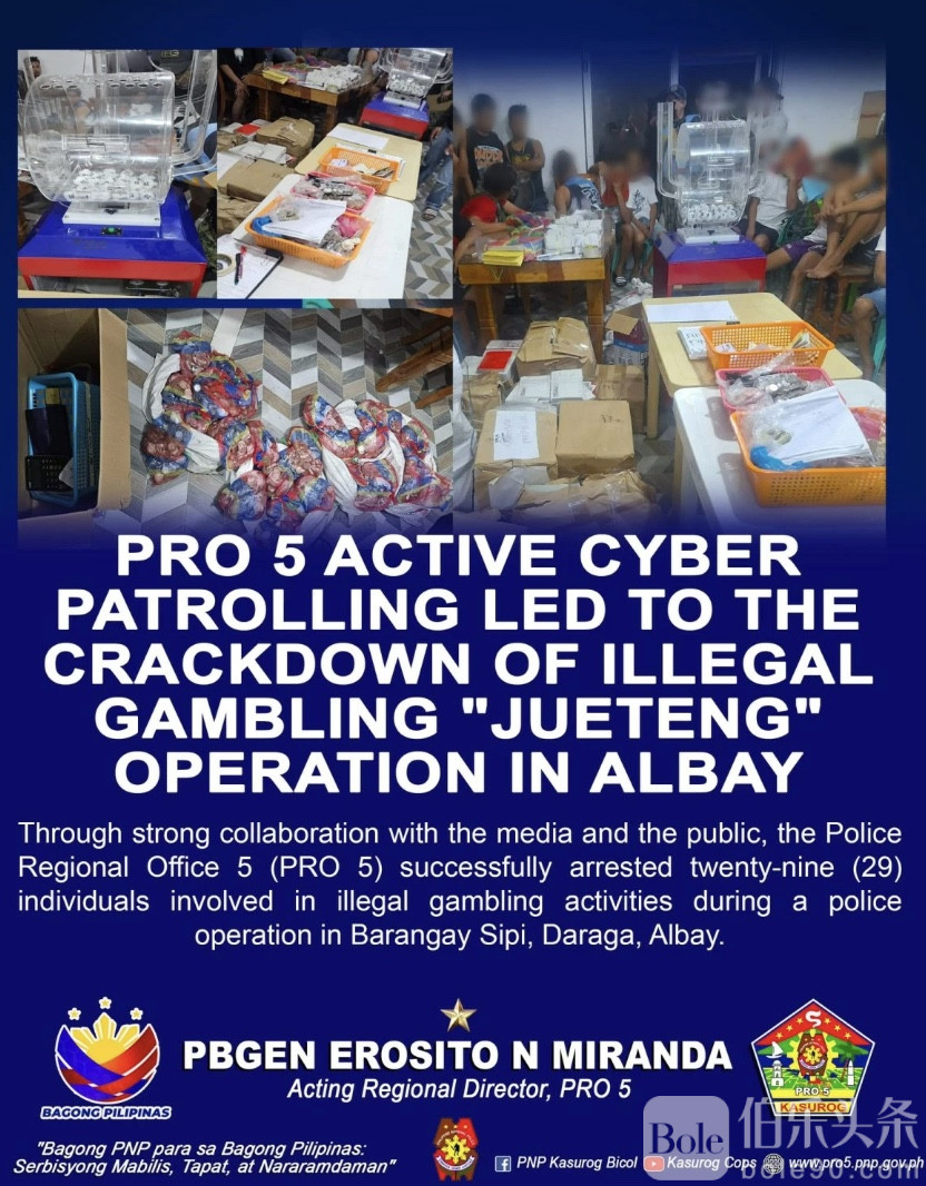 伯乐头条专讯:阿尔拜省达拉加镇Barangay Sipi社区周四夜晚,一场非法赌博的暗流被彻底打断。29名正在参与“jueteng”(非法数字彩票)的人士,在警方突袭行动中当场落网,赌资及相关赌具共计约24万比索被缴获。