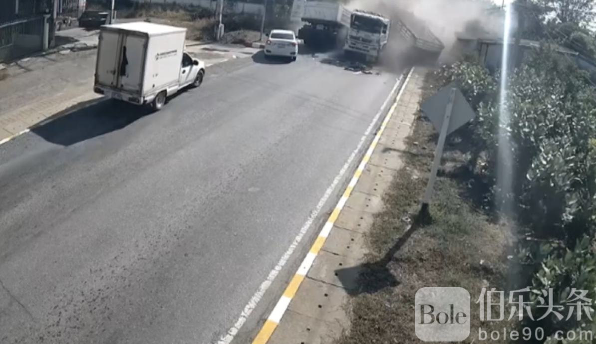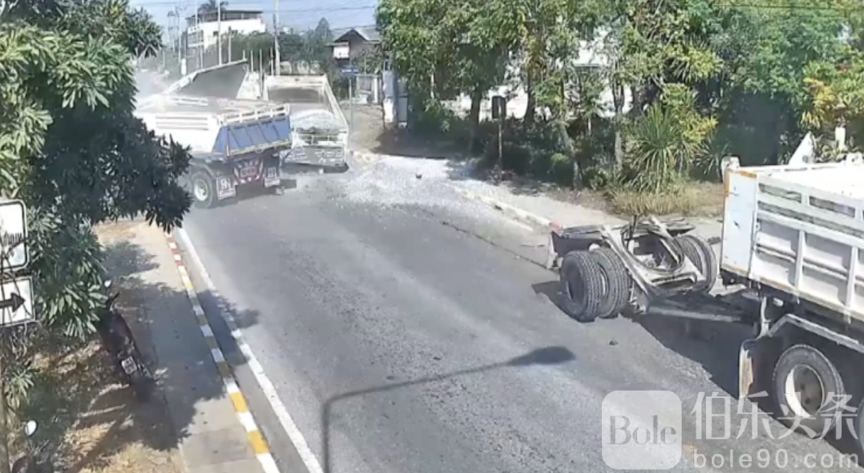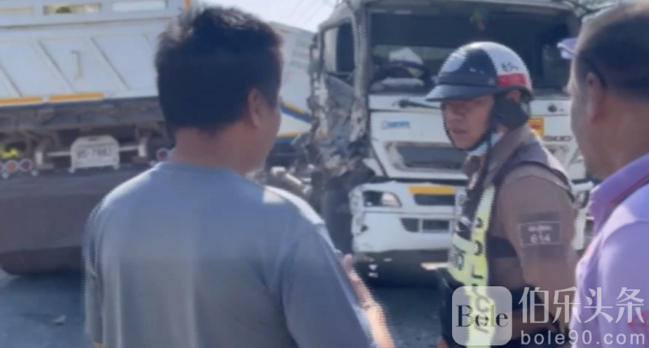 伯乐头条专讯:泰国素攀武里府乌通县23日上午发生一起惊魂交通事故,两辆大型拖挂货车在居民区道路猛烈相撞,其中一辆运输燃气的拖挂车发生气体泄漏,现场发出持续“嘶嘶”声,随时可能引发爆炸,附近居民被迫紧急疏散,整条道路一度陷入高度危险状态。