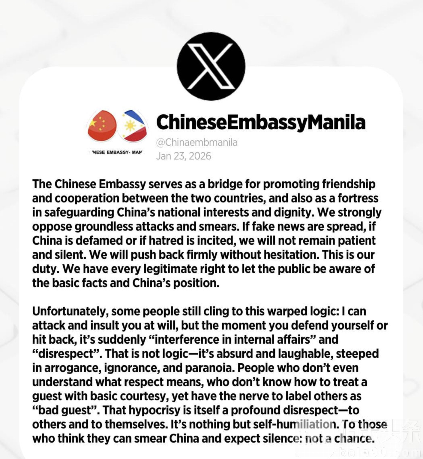 中国驻菲使馆最后以强硬口吻回应外界批评:“那些认为可以抹黑中国、却期待中国保持沉默的人——那是不可能的。”